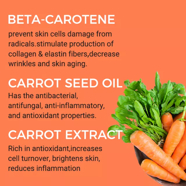 Organic Carrot extracts, Quince seed, Aloe-vera extracts, Almond oil extracts, Vitamin E oil extracts, Beta-carotene, Nyctanthes arbortristis extracts, Kojic Acid, Lactic Acid, Citric Acid, Aspergillus Ferment, Daucus Carota Sativa Root Extract